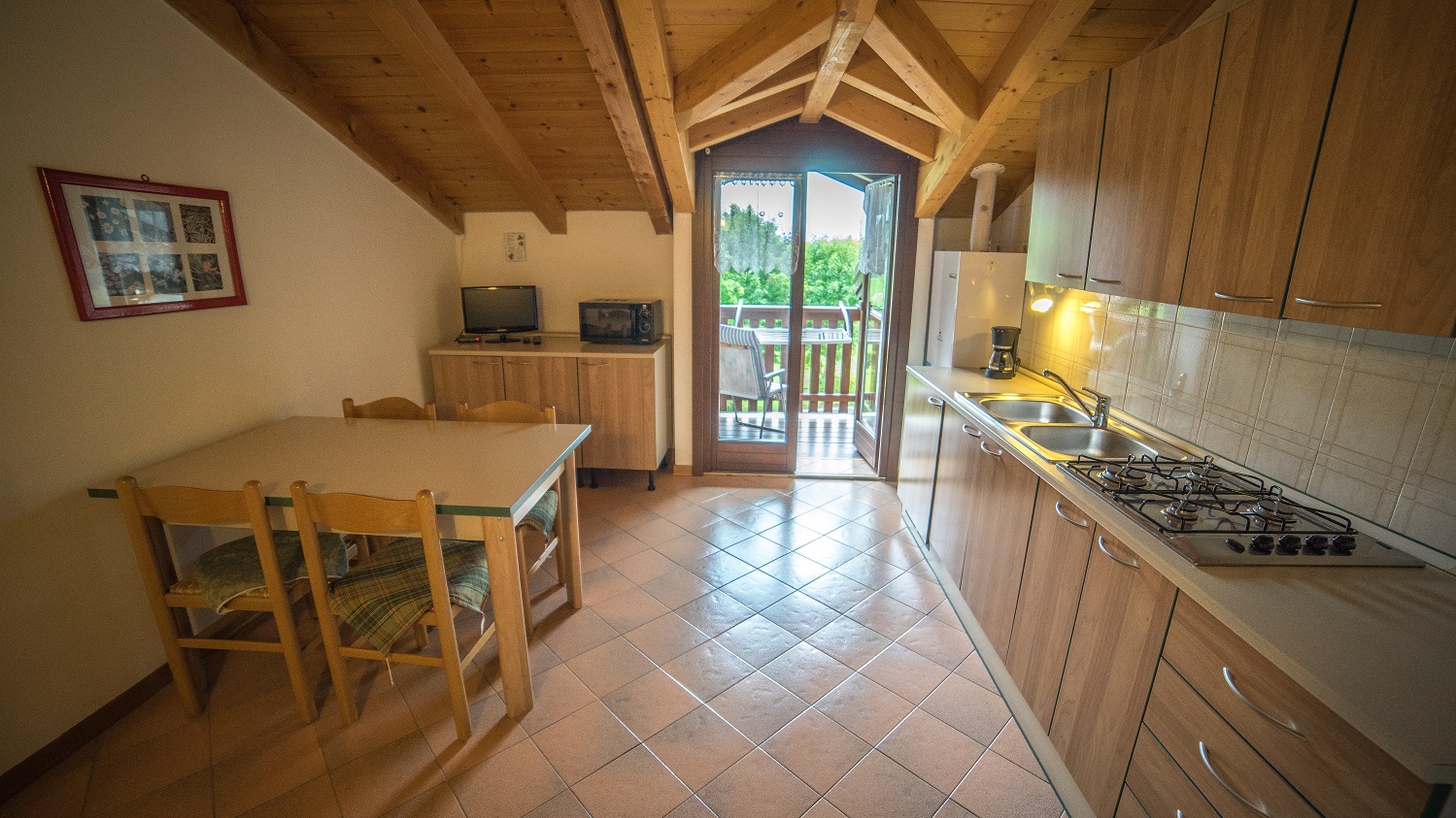 BILOCALE 4 PERSONE: 45 mq. 2° piano mansardato. L'appartamento è composto da: soggiorno con angolo cottura, una camera con letto matrimoniale e letto a castello, bagno con vasca/WC. Due balconcini.