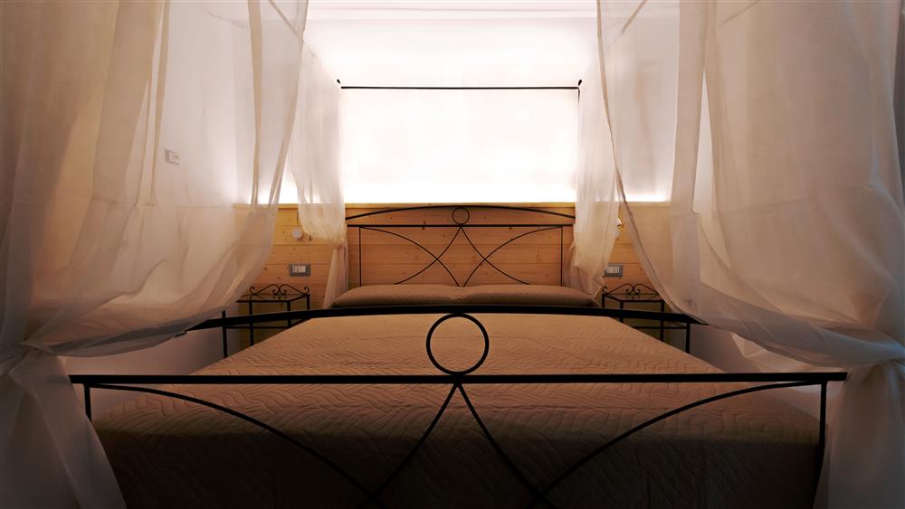 BILOCALE 2/4 PERSONE – IDEALE PER COPPIE : 45 mq. Ingresso indipendente. Piano terra con terrazzo ammobiliato e recintato. Moderno angolo cottura, soggiorno con divano letto doppio, una camera matrimoniale speciale (con letto tondo oppure a baldacchino), bagno con bidet e wc, lavandino e doccia open space a vista.